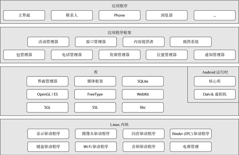 Android 操作系统的系统架构总体分为 4 层,由上到下依次是: