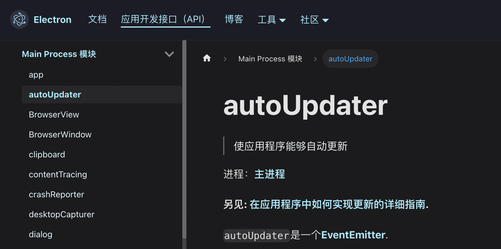 如果细看 Electron 文档,会发现官方提供了一个 autoUpdater 功能来实现自动更新,如图: