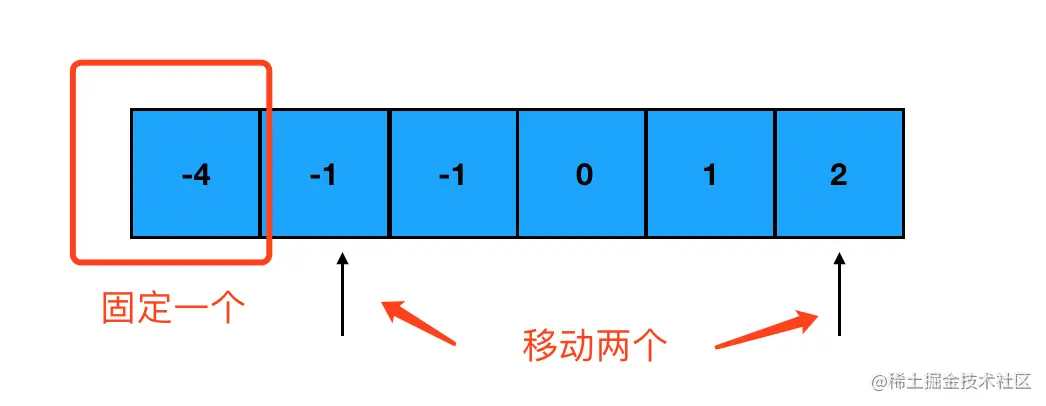 具体方法,仍然是使用指针来缩小搜索的范围。对于三数求和,我们使用 “固定一个,移动两个”的方式,如图: