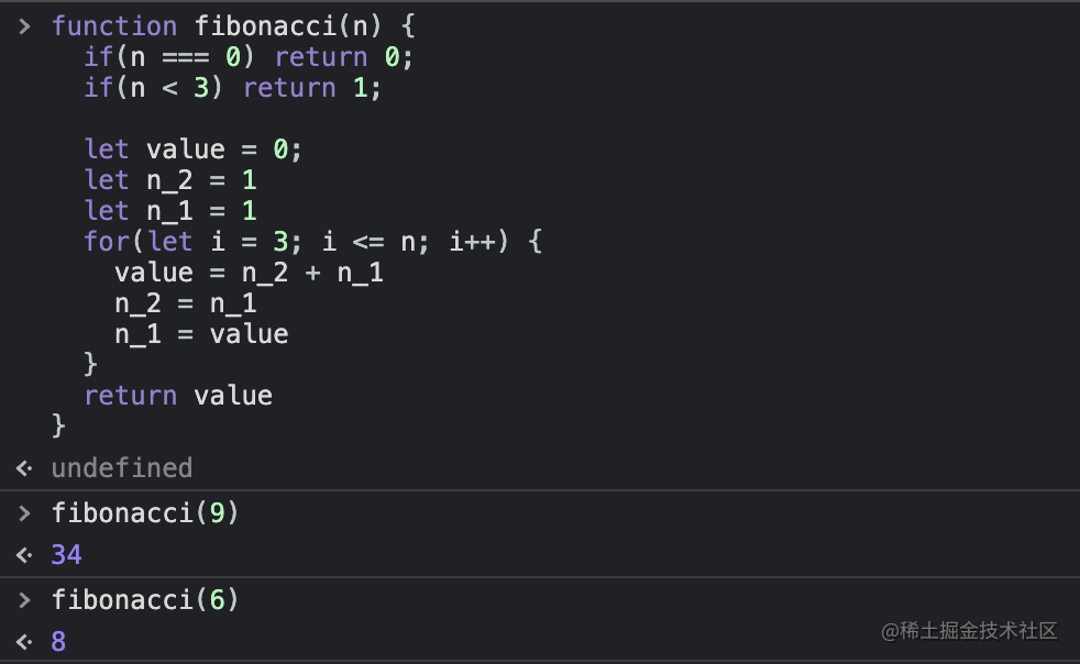 function fibonacci(n) {if (n === 0) return 0;if (n <= 2) return 1;let value = 0;let n_2 = 1;let n_1 = 1;for (let i = 3; i <= n; i++) {value = n_2 + n_1;n_2 = n_1;n_1 = value;}return value;}
