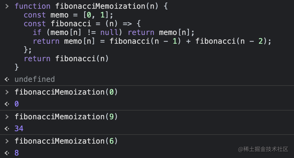 function fibonacciMemoization(n) {const memo = [0, 1];const fibonacci = (n) => {if (memo[n] != null) return memo[n];return (memo[n] = fibonacci(n - 1) + fibonacci(n - 2));};return fibonacci(n);}